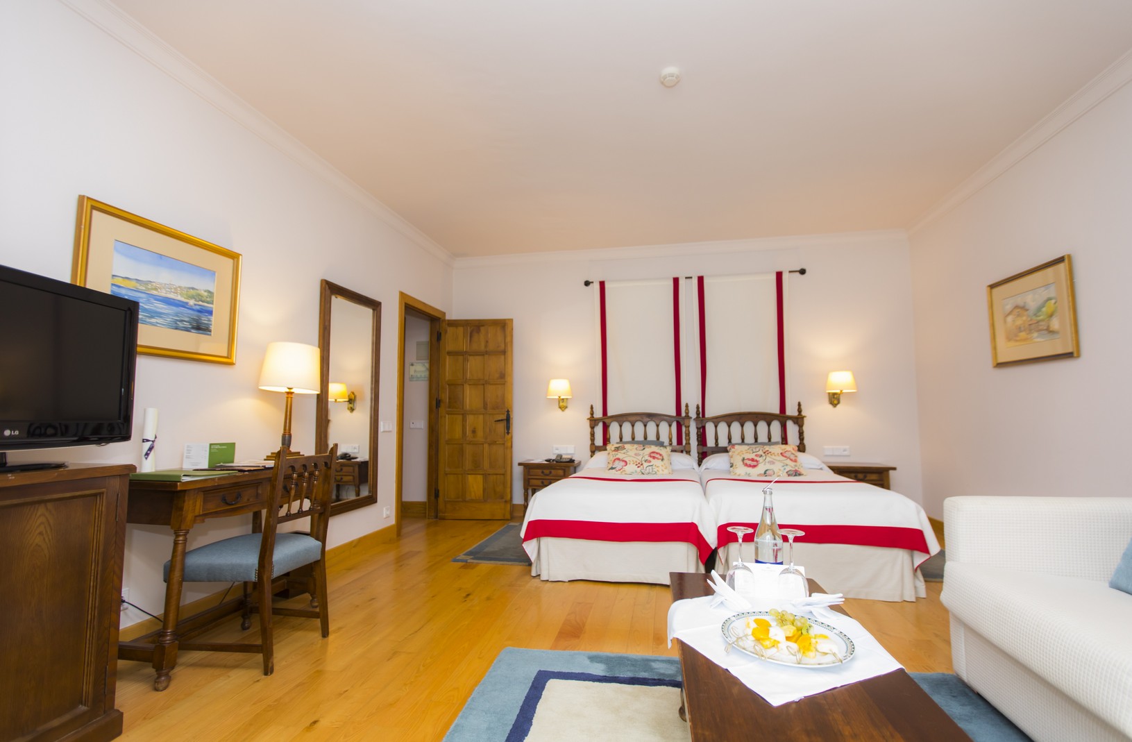 The Marqués de Sargadelos Room is the Parador's largest. Good taste and elegance are the two characteristic features of this room, which once welcomed Spanish Nobel laureate Severo Ochoa, among others important figures, including politicians and even prime ministers. In addition to providing all the necessary services and extras, its fine wood paneled sitting room and large enclosed balcony overlooking Ria de Ribadeo offer the best views of the sea and Asturian coast. Brightness and comfort join forces to make your stay an exquisite memory with great added value.